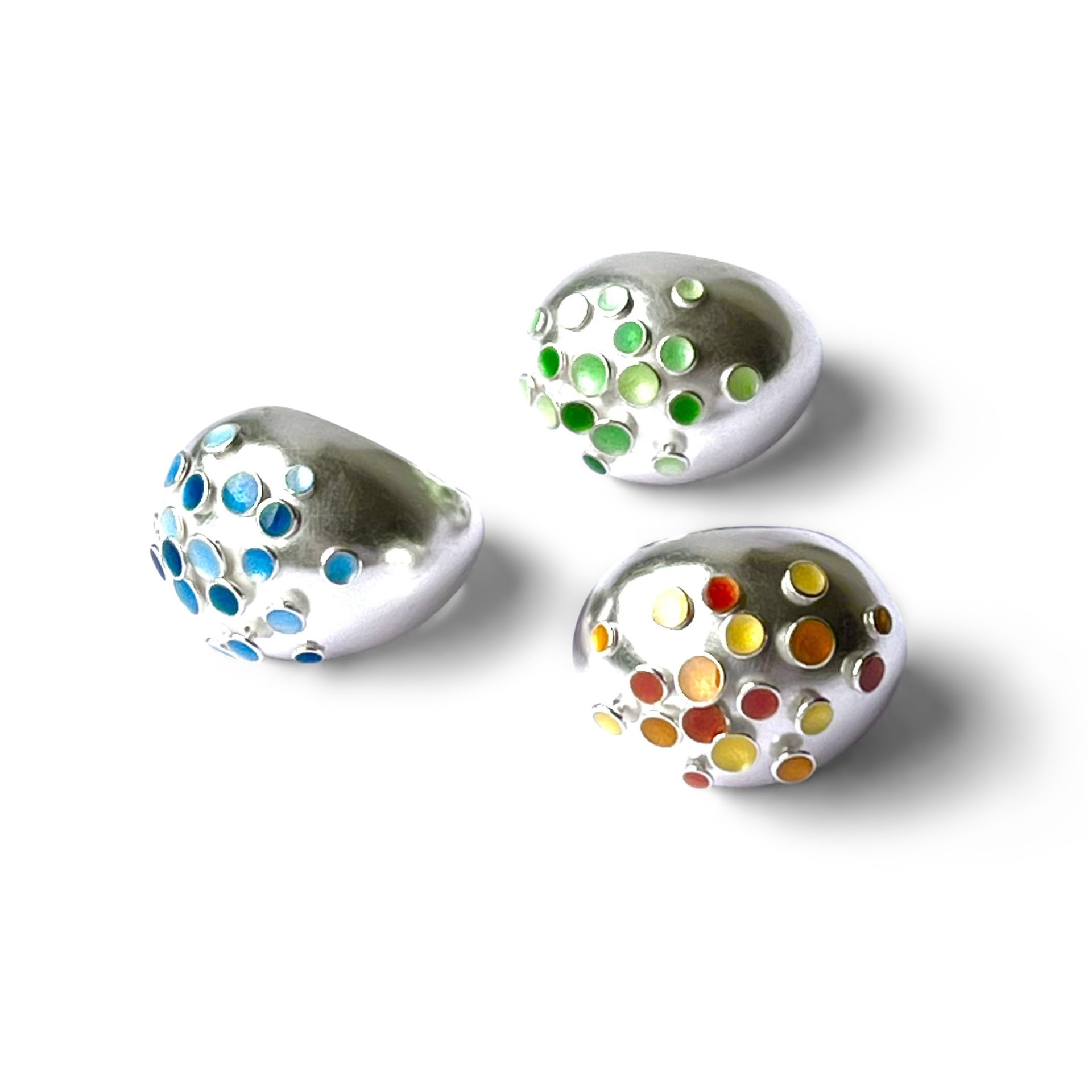 Claire works with silver and gold and enjoys exploring inventive ways of incorporating colour, texture and movement into her designs. In the past few years, she has returned to enamel, making her own “beads” in the form of tiny enamelled elements. The movement inherent in these “beads” adds fluidity to her designs. Claire enjoys the continuing challenge of working out how to make and attach these elements and hopes to keep pushing the boundaries of what she believes to be possible.