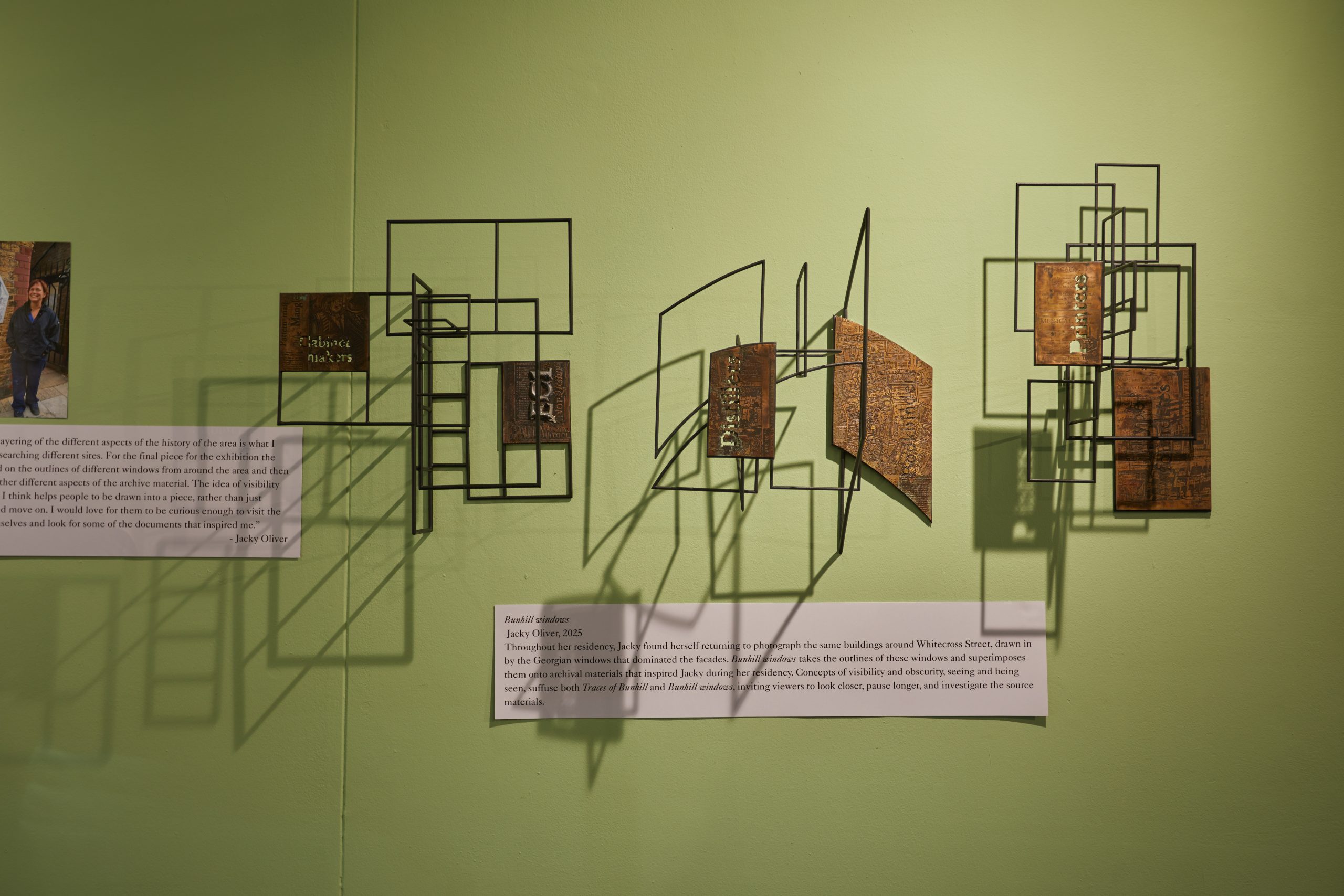 The exhibition brings together the series of postcards she created, maquettes and work later developed at Cockpit. There are banners showing the designs for the 8 enamel panels that are now permanently on display around Islington, as well as the piece ‘ Bunhill Windows’ which was created especially for the exhibition.