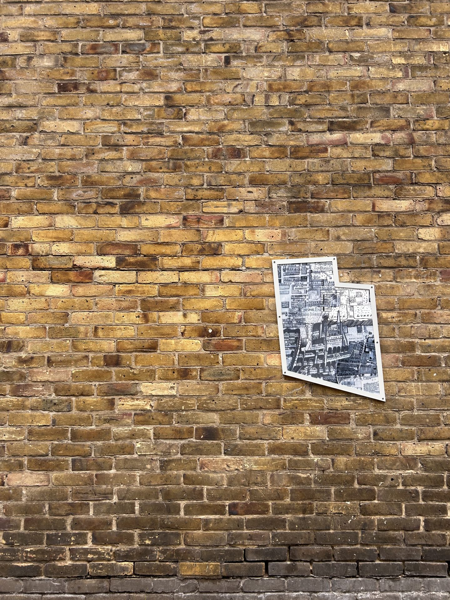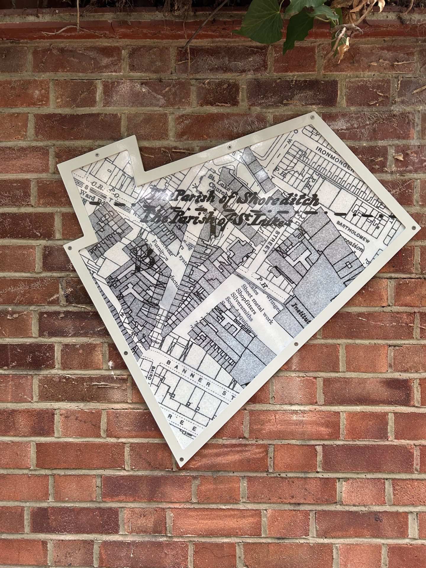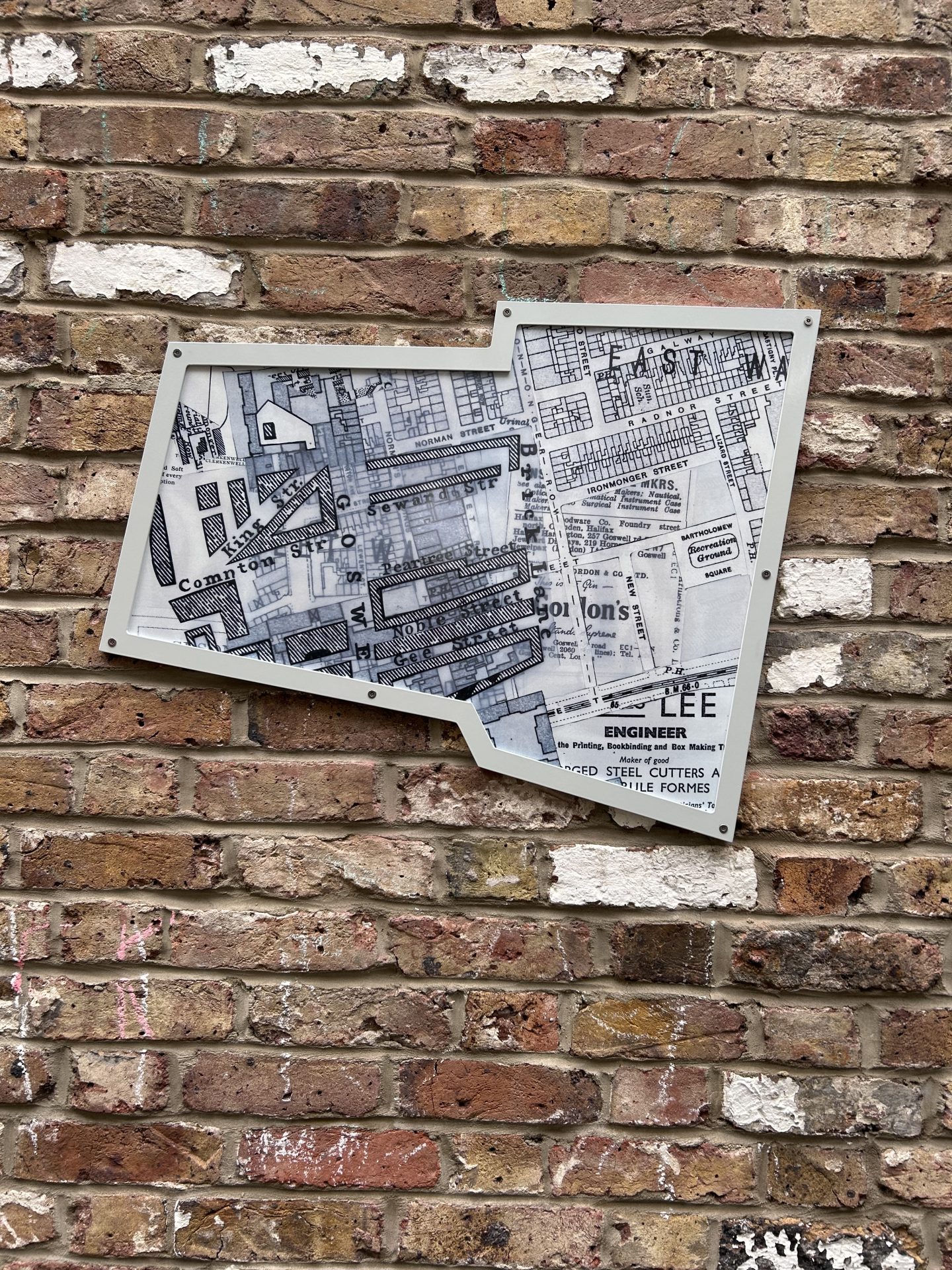Jacky’s final artwork, Traces of Bunhill, is installed on buildings across Bunhill, creating enamelled windows into Bunhill’s past. Her collage-inspired process is clearly expressed in these pieces, with precisely extracted maps of buildings and blocks punching straight through to clipped sections of text or layers of other, older maps and building plans. These historic documents are clearly archival but displaced—centuries-old documents overlap and peek through modern materials, flattening time and bringing nineteenth century craftsmen, seventeenth century fields, and modern viewer into the same plane of existence. Her work suggests a continuum, reminding viewers that this place once belonged to someone else, that other feet walked these streets, and that we are part of a chain of overlapping but distinct moments in time.