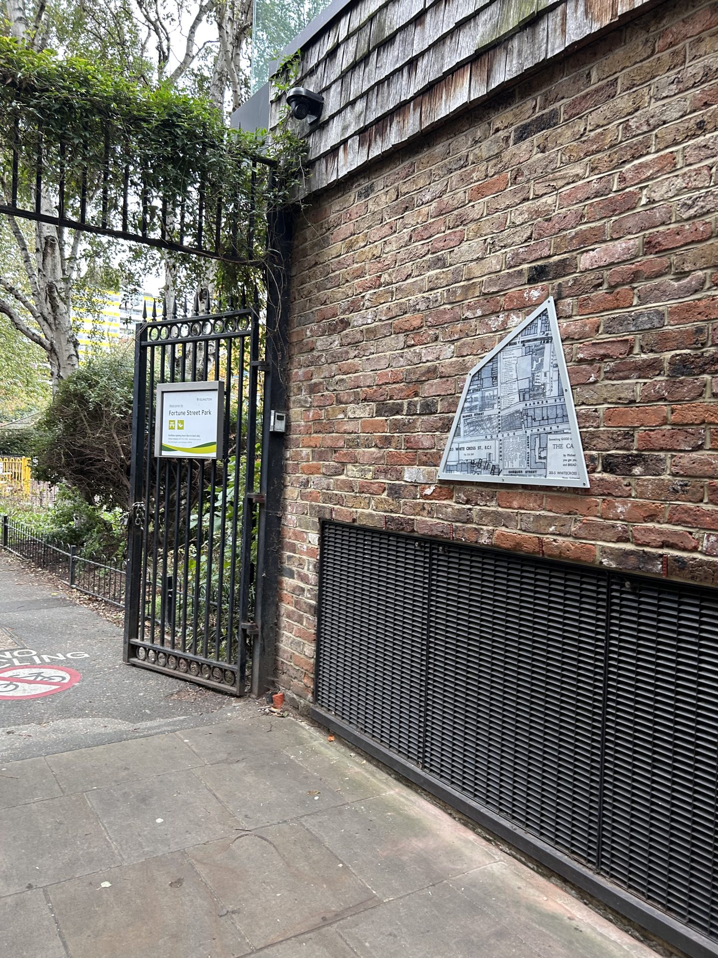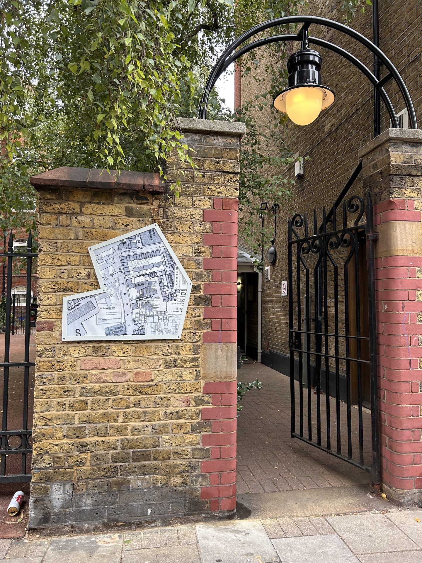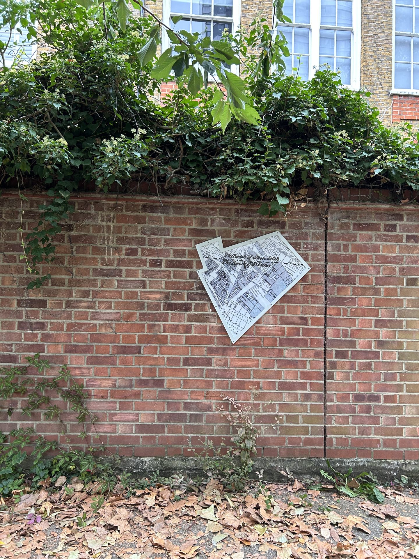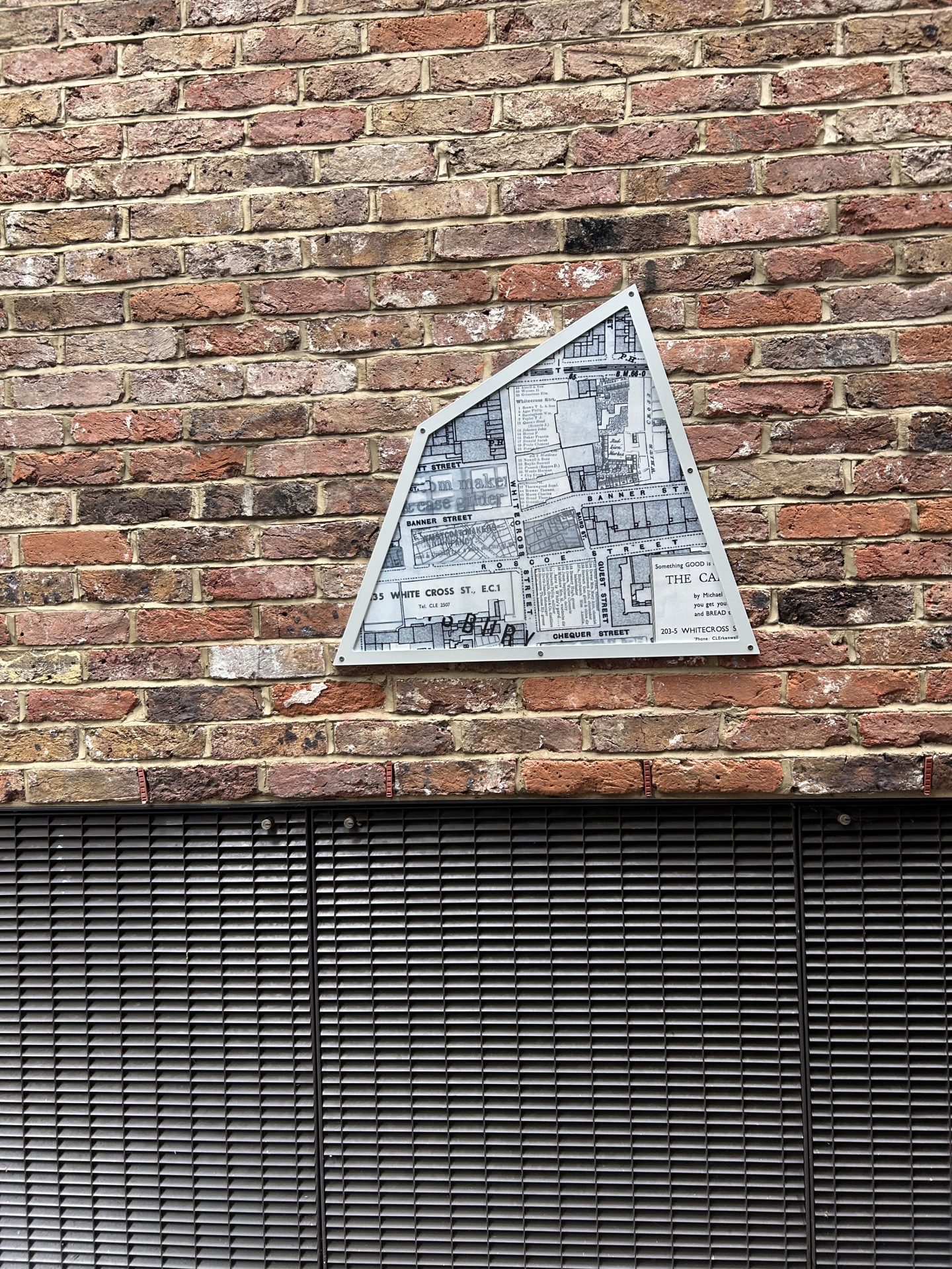 Jacky’s final artwork, Traces of Bunhill, is installed on buildings across Bunhill, creating enamelled windows into Bunhill’s past. Her collage-inspired process is clearly expressed in these pieces, with precisely extracted maps of buildings and blocks punching straight through to clipped sections of text or layers of other, older maps and building plans. These historic documents are clearly archival but displaced—centuries-old documents overlap and peek through modern materials, flattening time and bringing nineteenth century craftsmen, seventeenth century fields, and modern viewer into the same plane of existence. Her work suggests a continuum, reminding viewers that this place once belonged to someone else, that other feet walked these streets, and that we are part of a chain of overlapping but distinct moments in time.