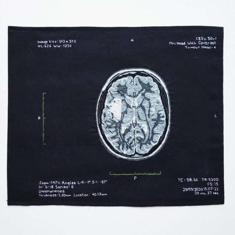 The result is a collection of deeply personal embroidered pages tracing her journey through fear, resilience, and acceptance. These pages will be brought together later this month in ‘Brain Tumour Book‘, a free exhibition and fundraiser for the Brain Tumour Charity at Fitzrovia Chapel from 17–26 April.